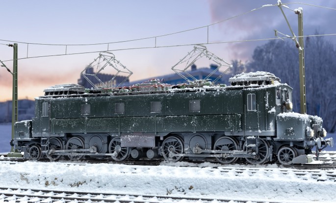 Die Lok der Bauart FC 2X3/4 der SBB, später auch als Ce 6/8 I bezeichnet bewährte sich auch im Winter auf der Gotthardstrecke sehr gut. Das limitierte Spur 1 Modell gibt die Lok in der grünen Farbgebung wieder, wie sie bis zum Schluss ihrer Einsatzzeit unterwegs gewesen ist. Das Modell stellt den harten Wintereinsatz nach und wurde dazu in Handarbeit winterlich dekoriert und "verschneit". Die Lokomotive ist heute noch als Museumslok in Verkehrshaus in Luzern erhalten - nun allerdings wieder in ihrer ursprünglichen, braunen Farbgebung.